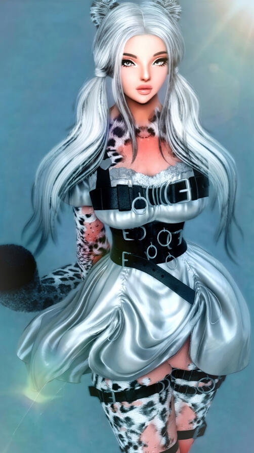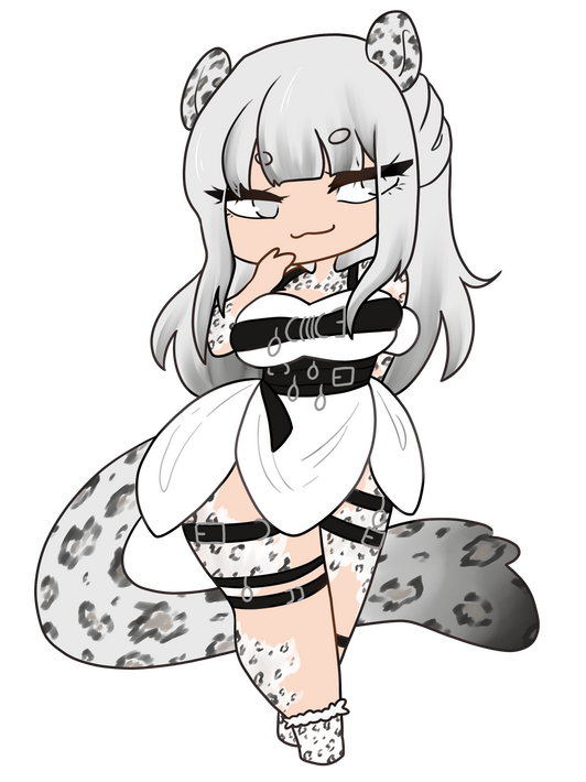 Tufted snow-leopard ears peek from beneath her thick hair, tipped in black and ever-alert. A long, expressive tail sways behind her—white with smoky grey rosettes, often dusted with snow or adorned in charms of bone and leather.